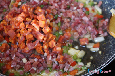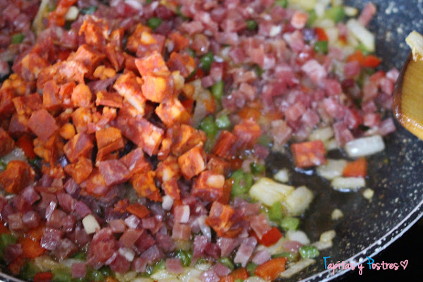 Cuando la verdura esté pochada, agregamos los taquitos de jamón y de chorizo y sazonamos con sal (poca que ya lleva el jamón), pimienta y las hierbas provenzales.