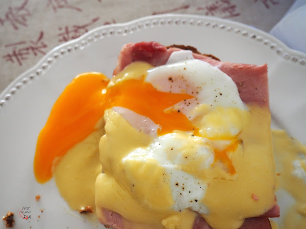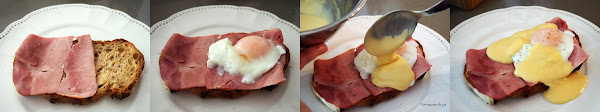 Colocar encima una loncha de jamón asado (en este caso hemos usado lacon), que previamente habremos calentado en la sartén. Poner el huevo encima, salpimentar y rociar con la salsa holandesa al gusto. Cuchillo y tenedor y a disfrutar!!!
