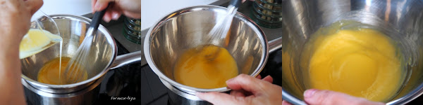 Colocar el bol en el cazo al fuego (baño maría) y batir con las varillas hasta que la mezcla empiece a espesar.