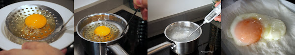 Los huevos han de ser lo más frescos posible, la clara tiene menos agua y es más consistente. Truco del chef Heston Blumenthal: cascarlo encima de un colador para perder la parte aguada. También recomienda colocar un plato boca abajo en la cazuela para que los huevos no toquen el fondo.