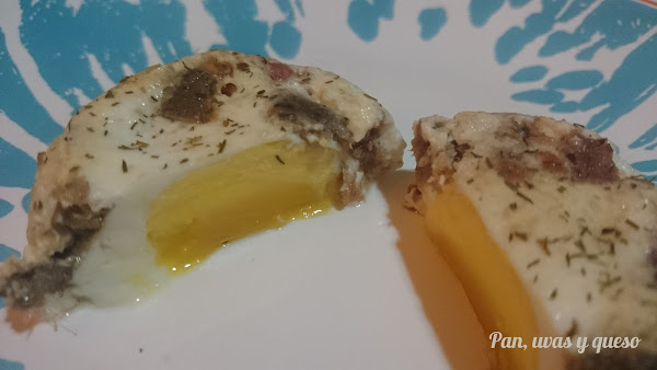 Cogemos uno de los montones de anchoas y lo repartimos entre los 8 moldes. Después, cascamos un huevo en cada molde. Añadimos media cucharada de nata (crema de leche) sobre el huevo y repartimos el otro montón de anchoas.