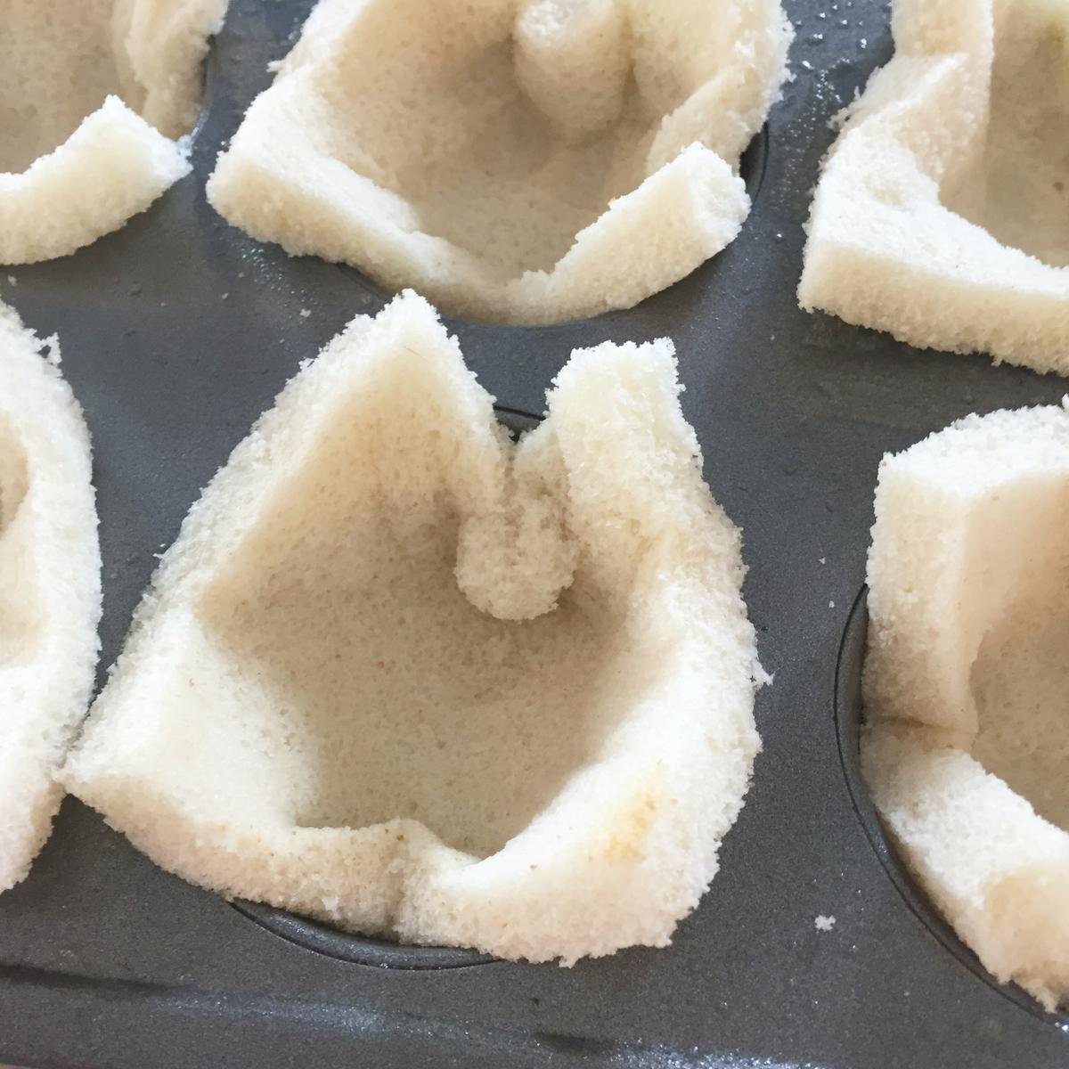 Luego de haber echado aceite en “spray” en el molde de muffins, acomodamos las rebanadas de pan: