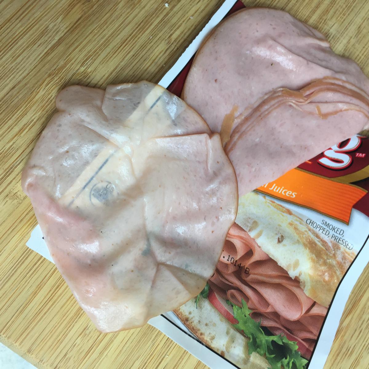 Sobre cada rebanada de pan, ponemos una rebanada de jamón fino en forma redonda.