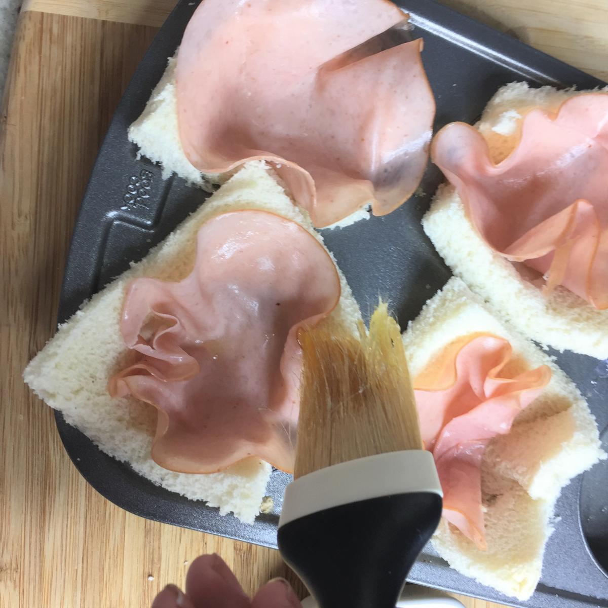 Sobre el pan en el molde, pon una rebanada de jamón.