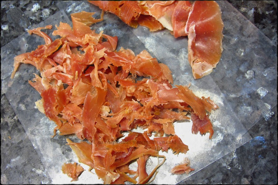 Mientras se fríen las patatas desmenuzar en cachitos las lonchas de jamón.