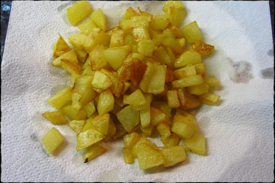 Sacar las patatas ya listas y ponerlas sobre papel absorbente para que absorba el exceso de aceite.
