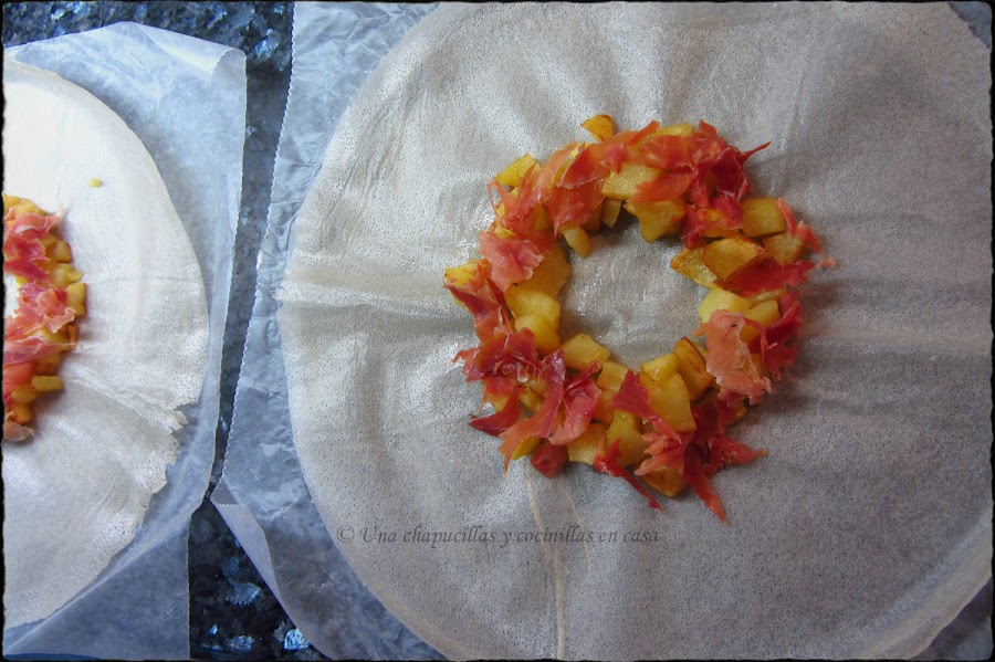 Sacar las obleas de pasta brick y disponer la mitad de las patatas en un oblea junto con la mitad del jamón y la otra mitad en la otra, claro está, y colocarlas en forma de corona como muestro en la foto, dejando hueco en medio.