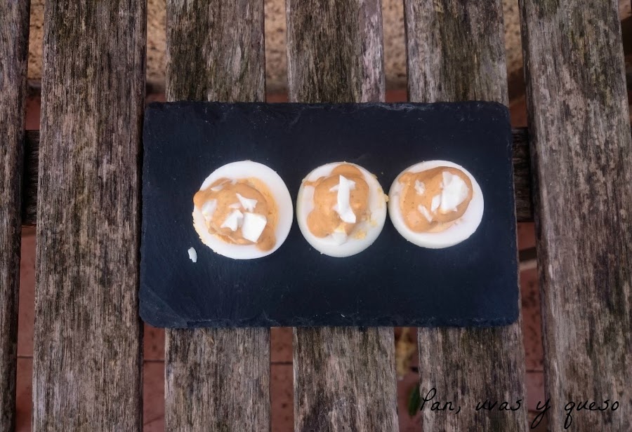 Cortamos los otros 8 huevos y medio en rodajas y los colocamos en un plato. Los extremos de los huevos los retiramos y los picamos.