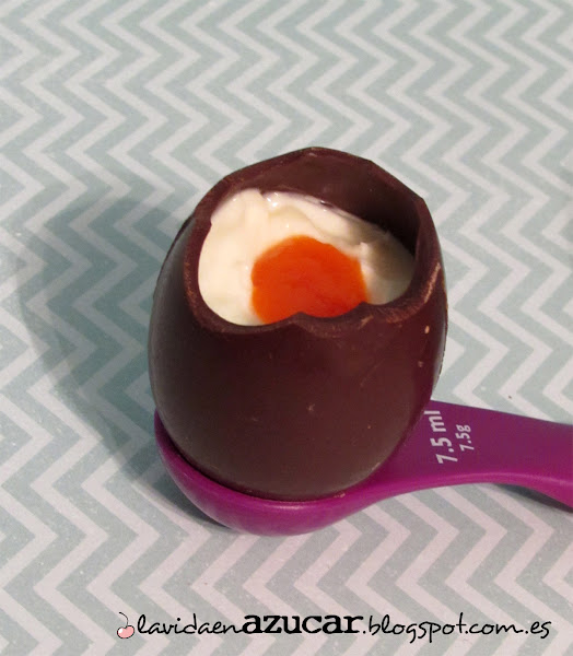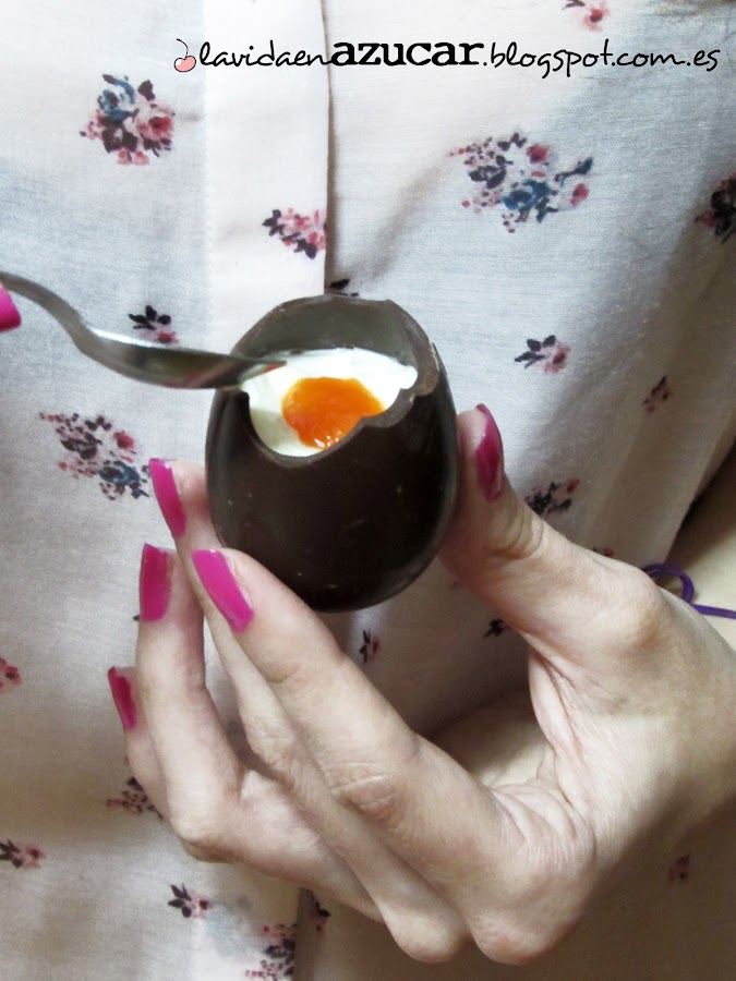 3. La tercera versión son huevos de chocolate rellenos de yogur con mermelada de albaricoque. Para hacerlo, rellenamos un huevo de chocolate con yogur griego azucarado y para simular la yema, pondremos un poquito de mermelada de albaricoque (sí, en éste también usé colorante naranja :p).