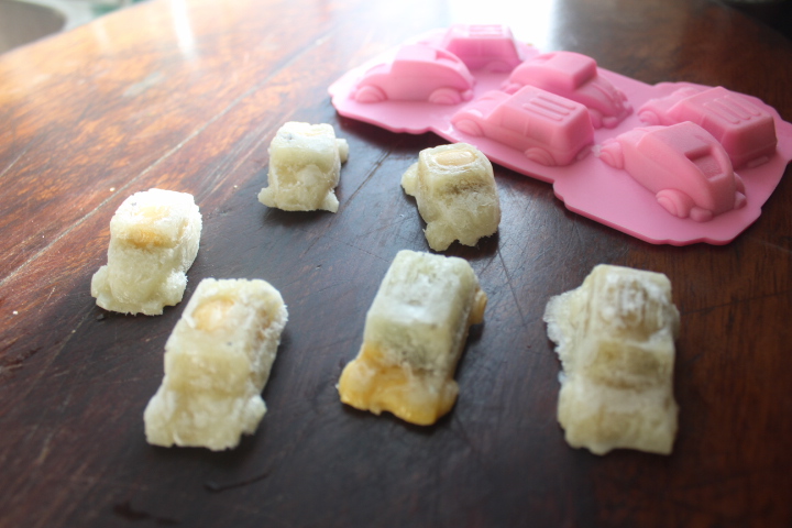 Una vez elegido el molde (en este caso uno con forma de coches) lo aceitamos bien para ayudar a desmoldarlo.