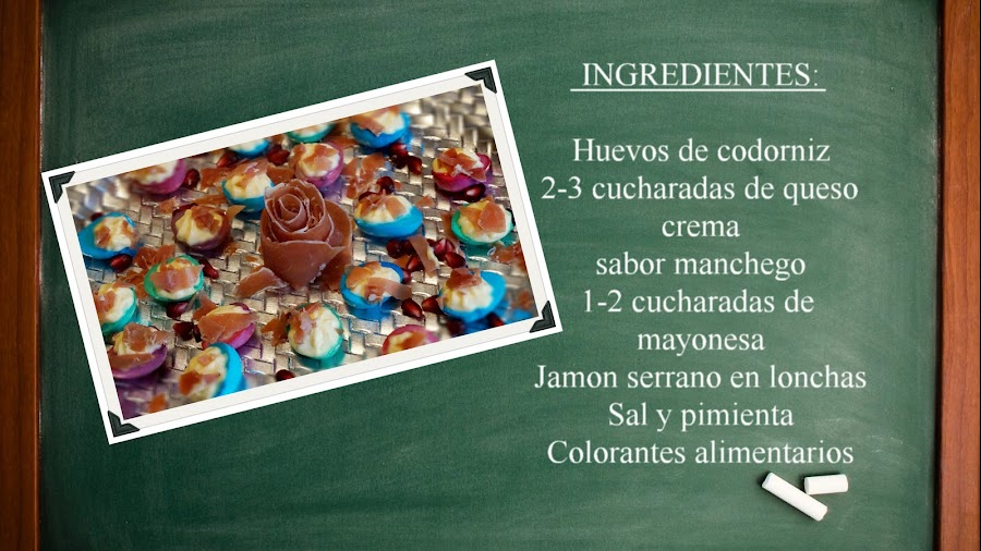 Ahora cogeremos un bol y mezclaremos en el las yemas cocidas,la crema de queso,la mayonesa,la sal y la pimienta. Lo batiremos bien hasta se que forme una crema densa con la que rellenaremos nuestros huevos. Una vez bien secas las claras cocidas las rellenaremos con la crema hecha anteriormente con la ayuda de una manga pastelera,yo usé una manga con una boquilla rizada. Una vez rellenos los pondremos en un plato y les agregaremos un poco de jamón serrano picado bien fino. También podemos agregarle al plato un poco de color esparciendo un puñado de granos de granada.