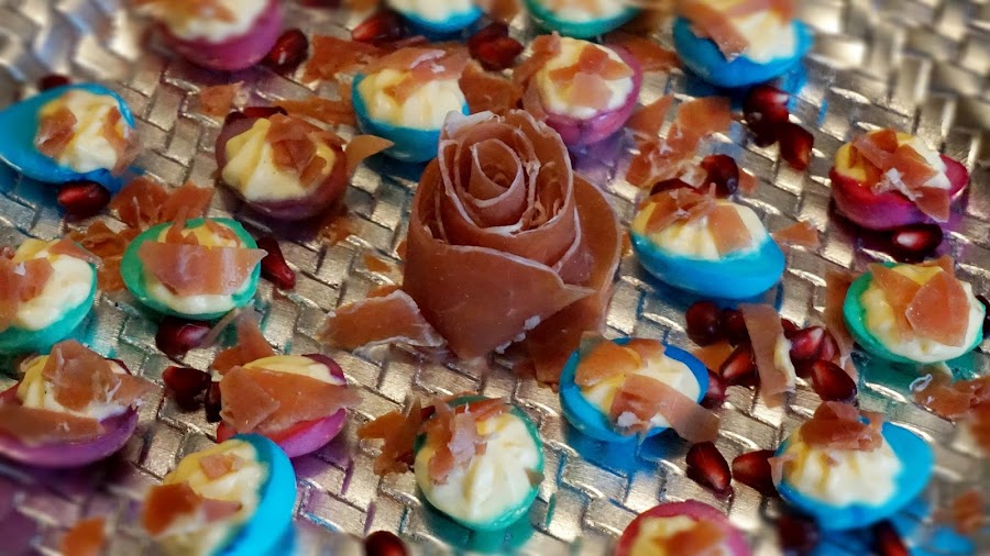 Ahora cogeremos un bol y mezclaremos en el las yemas cocidas,la crema de queso,la mayonesa,la sal y la pimienta. Lo batiremos bien hasta se que forme una crema densa con la que rellenaremos nuestros huevos. Una vez bien secas las claras cocidas las rellenaremos con la crema hecha anteriormente con la ayuda de una manga pastelera,yo usé una manga con una boquilla rizada. Una vez rellenos los pondremos en un plato y les agregaremos un poco de jamón serrano picado bien fino. También podemos agregarle al plato un poco de color esparciendo un puñado de granos de granada.