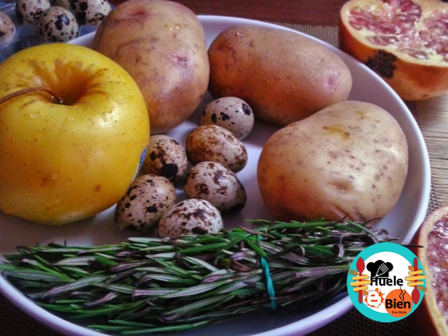 Si le pusiera un titulo a esta receta seria; Huevo de codorniz escalfado sobre patatas, con manzana asada y aceite con granada...Todo para describir este apetitoso entrante, que prepare el sábado pasado.