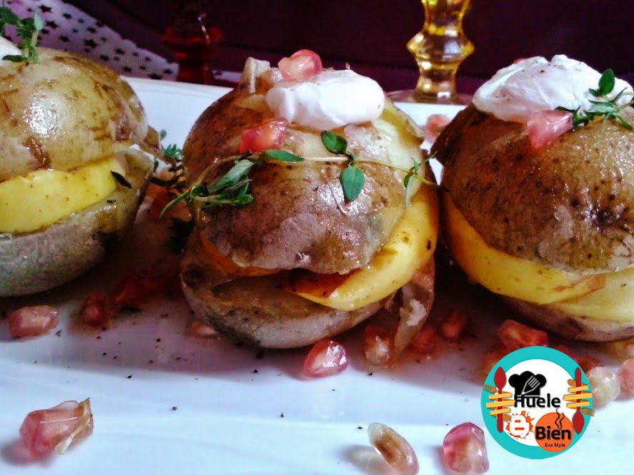 4.- Escalfamos los huevos en agua hirviendo con sal y vinagre, durante unos minutos. Escurrimos bien y colocamos un huevo sobre cada patata. Rociamos el aceite sobre ellas, salpimentamos nuevamente, ponemos las hojas frescas de tomillo y las semillas de la granada. Servimos enseguida.