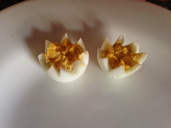 Empezaremos el corte. Cogeremos un cuchillo y en la mitad del huevo, haremos triangulos seguidos.