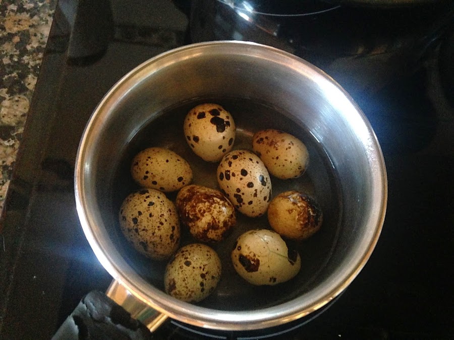 Pondremos un cazo al fuego con agua, sal y los huevos de codorniz.Los dejaremos unos 10 minutos.