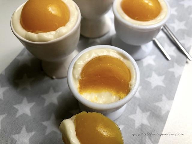 Si queréis con la mousse y las semi-esferas que os sobran podéis rellenar unas hueveras y hacer unos divertidos “huevos pasados por agua”.