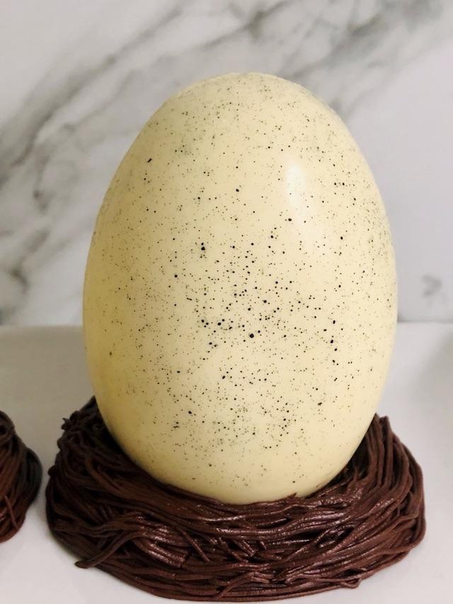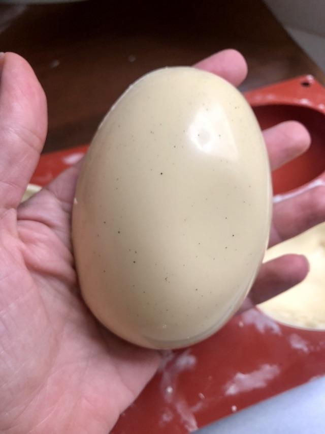 La cáscara del huevo está hecha con chocolate blanco atemperado vertido sobre las cavidades de un molde de silicona con forma de medio huevo de Silikomart. Con la ayuda de un poco de alcohol alimentario, un poco de tinte alimentario negro y un cepillo de dientes cree el efecto de las motas de la superficie del huevo. Primero lo hice en el molde antes de verter el chocolate pero puse pocas y luego una vez formado el huevo le añadí más.