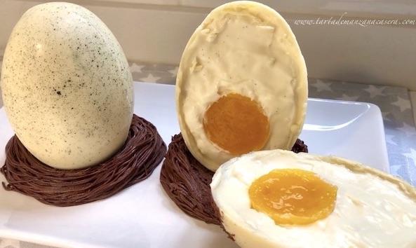 Mientras se gelatinizan las semiesferas preparamos el cremoso de vainilla. Hervir la leche e infusiones con vainilla. Agregar las hojas de gelatina hidratadas y escurridas y la glucosa. Añadir al chocolate derretido. Incorporar la nata (crema de leche) líquida y triturar. Cuando se enfríe verter sobre las cáscaras de huevo de chocolate, añadir las semi-esferas de mango. La preparación debe llegar al borde de las cáscaras de huevo, sin rebosar para poder luego cerrarlo y sin aquedaros cortos para que quede bonito al corte. Luego refrigerar (yo los dejé toda una noche en la nevera). Después pegad los bordes de los huevos con la ayuda de un poco de chocolate blanco derretido y afinad los bordes. Colocad sobre nidos de chocolate, podéis utilizar la boquilla césped para imitarlos, el buttercream queda espeso para que no pierda la forma.