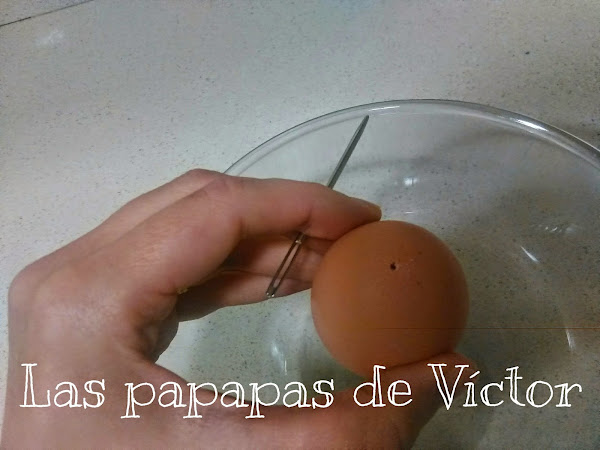 Con una aguja gruesa dar unos golpecitos al huevo en un extremo y después en el otro lado.