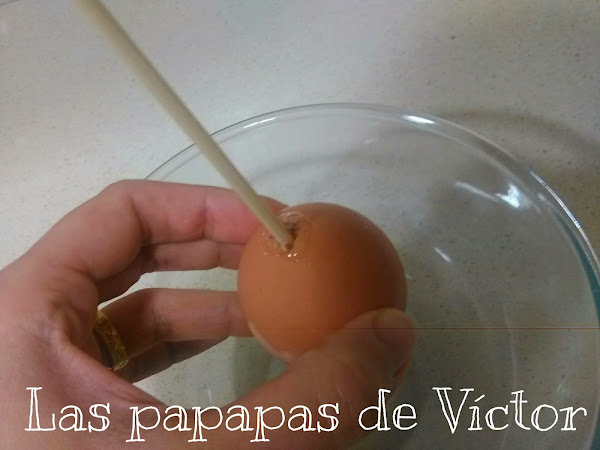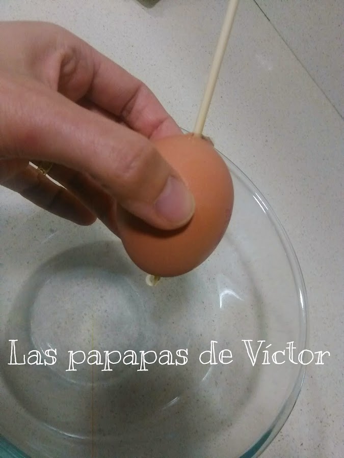 Después meter poco a poco dando círculos el palo brocheta hasta llegar al huevo y removemos un poco para que se mezcle la yema con la clara y sea mas fácil que después salga.