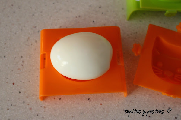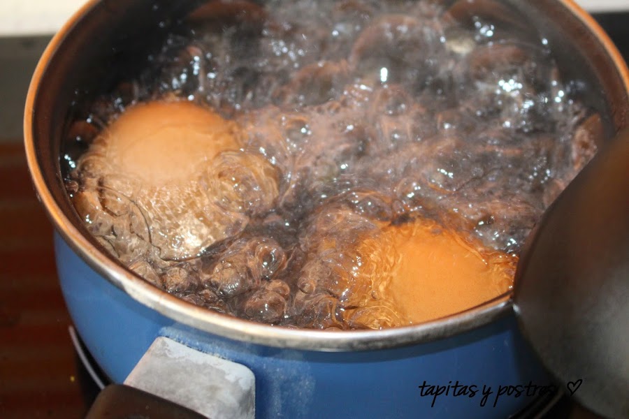 Empezamos cociendo los huevos como tengamos costumbre. Bien cocidos. Yo los cuezo nueve minutos, por sugerencia de las instrucciones del aparato. Supongo que para que la yema esté bien hecha.