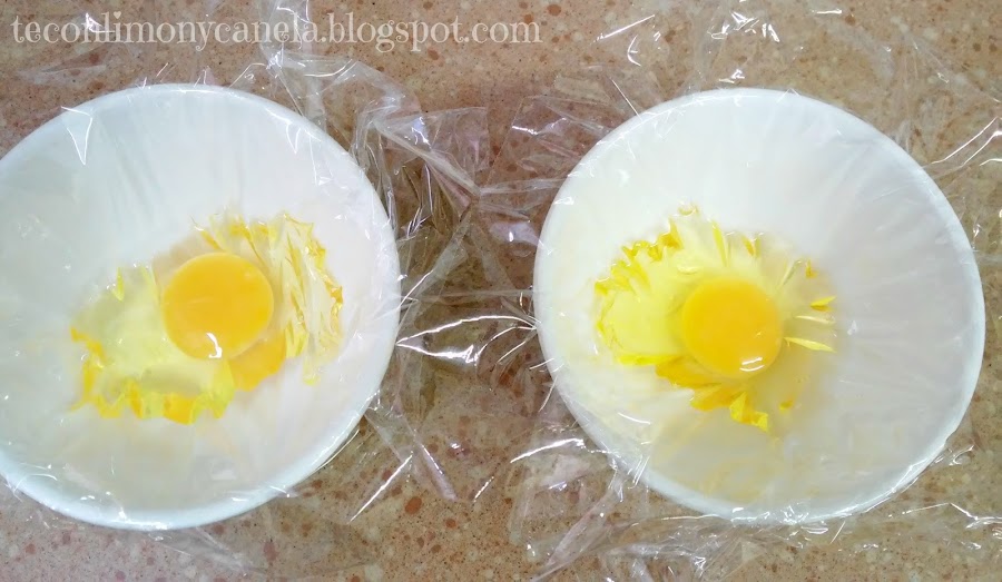 Preparamos los huevos. Para que sea más fácil escalfarlos y queden más bonitos, vamos a hacerlo con film de cocina. De hecho, al resultado de esta forma de escalfar se le llama "huevos en flor"