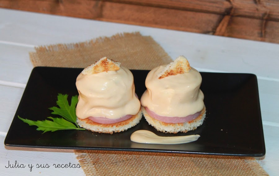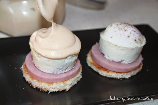 En la bandeja o plato donde los vayamos a servir ponemos las rodajas de pan tostado, encima la rodaja de jamón york, encima ponemos el huevo, y lo cubrimos todo con salsa rosa.