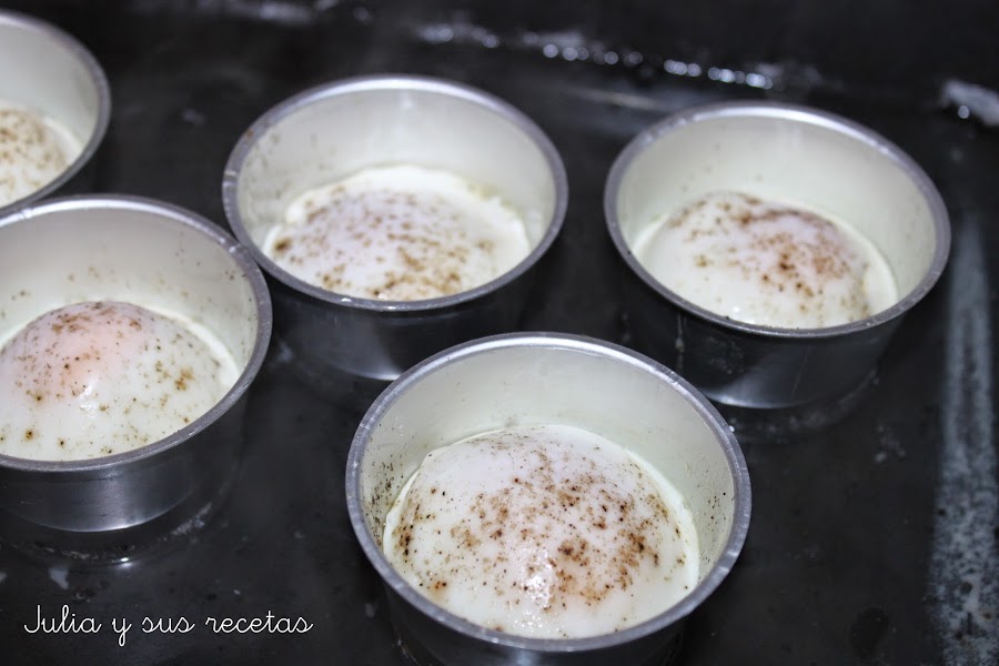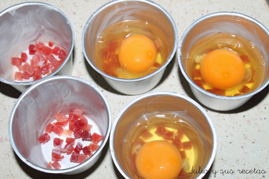 Untamos con aceite unas flaneras o moldes de magdalenas de silicona y ponemos en el fondo unos tacos de jamón, encima echamos un huevo entero (sin batir), le ponemos sal y pimienta molida encima.