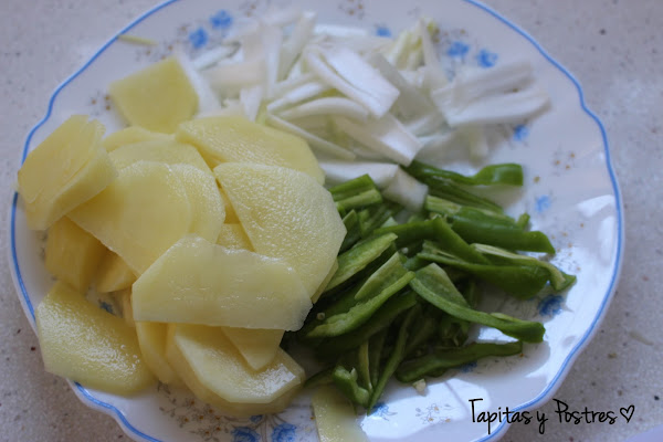 Cortamos las patatas a laminas no muy gruesas, los pimientos a tiras y la cebolla a rodajas.