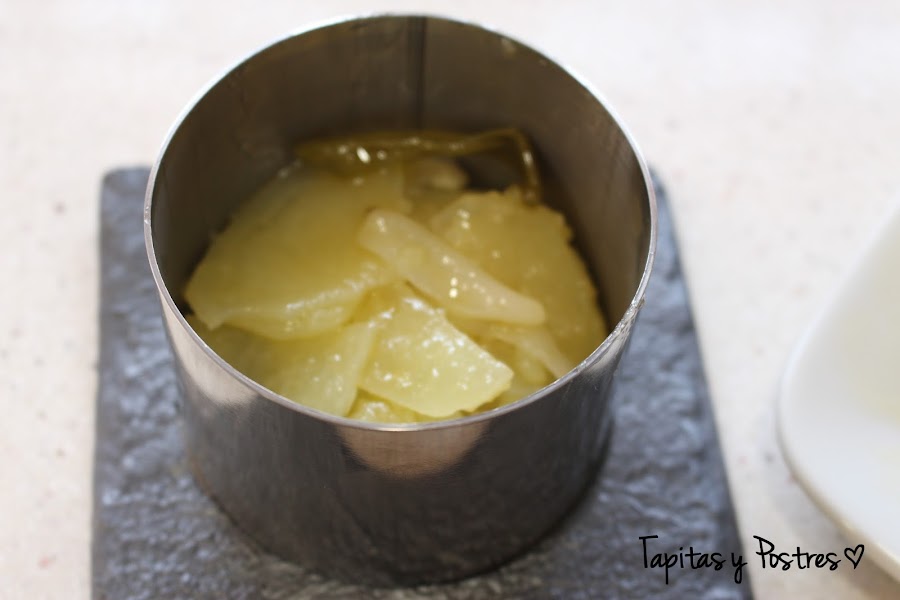 Al acabar de hacerse las patatas, escurrimos el exceso de aceite y comenzamos a emplatar. Podemos hacerlo sin nada, pero yo he usado un aro redondo de emplatar de unos 8 cm ( los compré en Lidl hace tiempo).