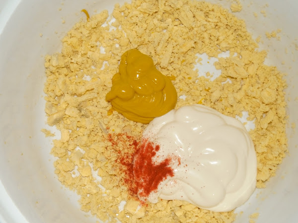 3)_Agrega 4 cucharadas grandes de mayonesa,2 cucharadas de mostaza y 1/4 cdta de paprika. Mezcla todo hasta integrar bien.