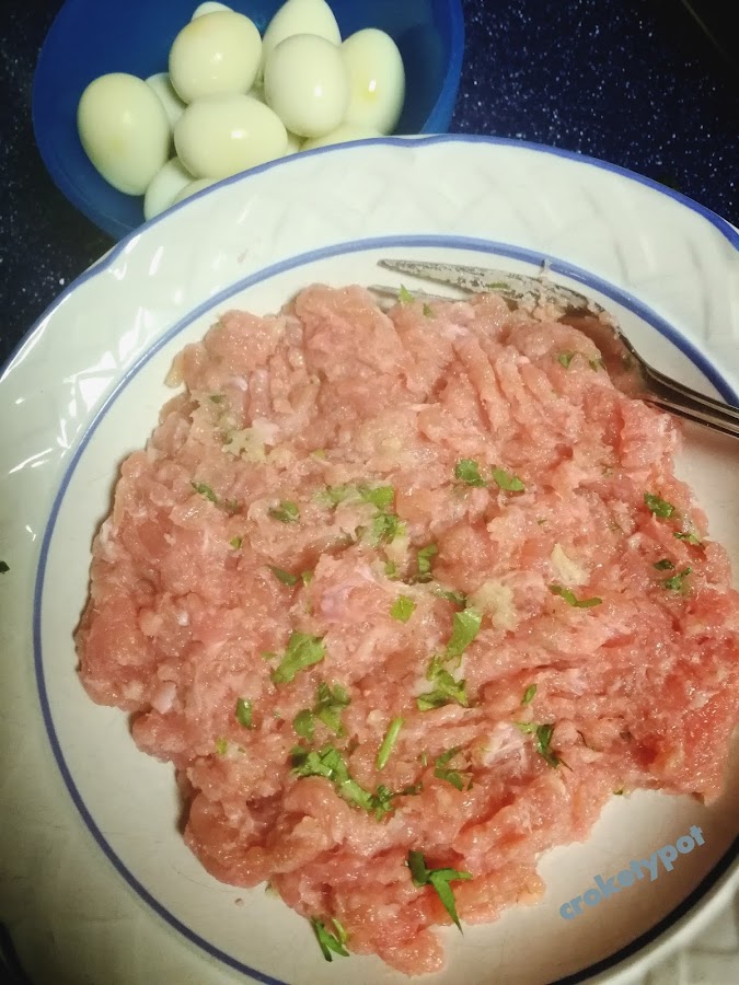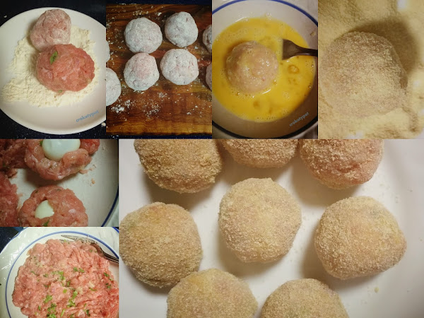 Como los hemos preparado para aperitivo y la cena de los niños, he utilizado huevo de codorniz que es más manejable y queda tamaño de albóndiga gorda, los hechos con huevos de gallina son para quedar bien satisfecho, se preparan con carne picada aderezada a gusto en lugar de salchicha.