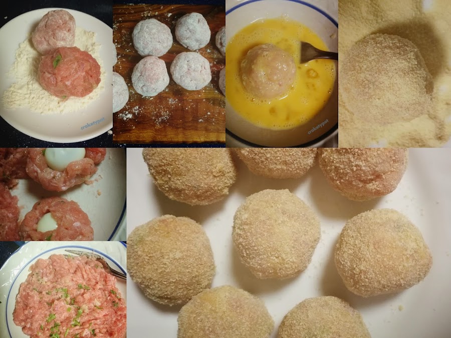 Para trabajar la carne y que no se pegue en las manos nos mojamos con vino blanco (truco de la abuela) y cogemos un poco de carne y vamos envolviendo el huevo cocido. Pasamos por harina y apretamos como una albóndiga y dejamos reposar en un plato para que la harina haga su efecto aglutinante. Así con todos, cuando los hemos reposado pasamos por huevo batido y luego por pan rallado. Y los tenemos listos para freír, a mi me gusta hacerlos en la freidora, los dejamos doraditos y para servirlos como he dicho al principio.