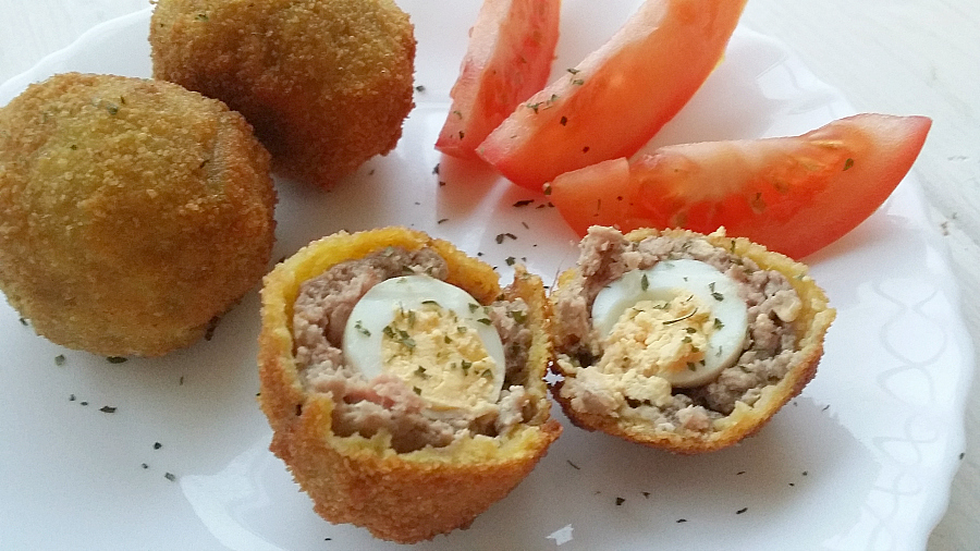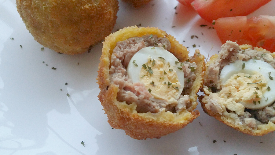 6. Pasamos los huevos escoceses por huevo batido y pan rallado, como si fuesen croquetas, y los freímos en abundante aceite. Retiramos a un plato con papel absorbente, para eliminar el excedente de aceite.