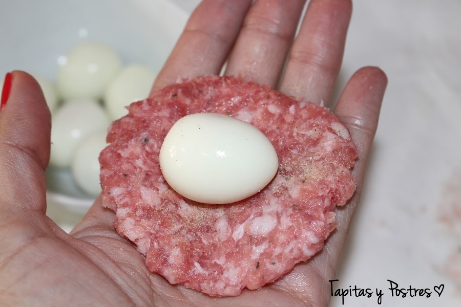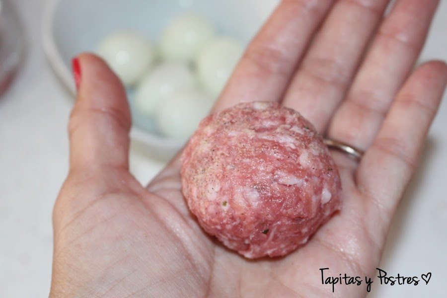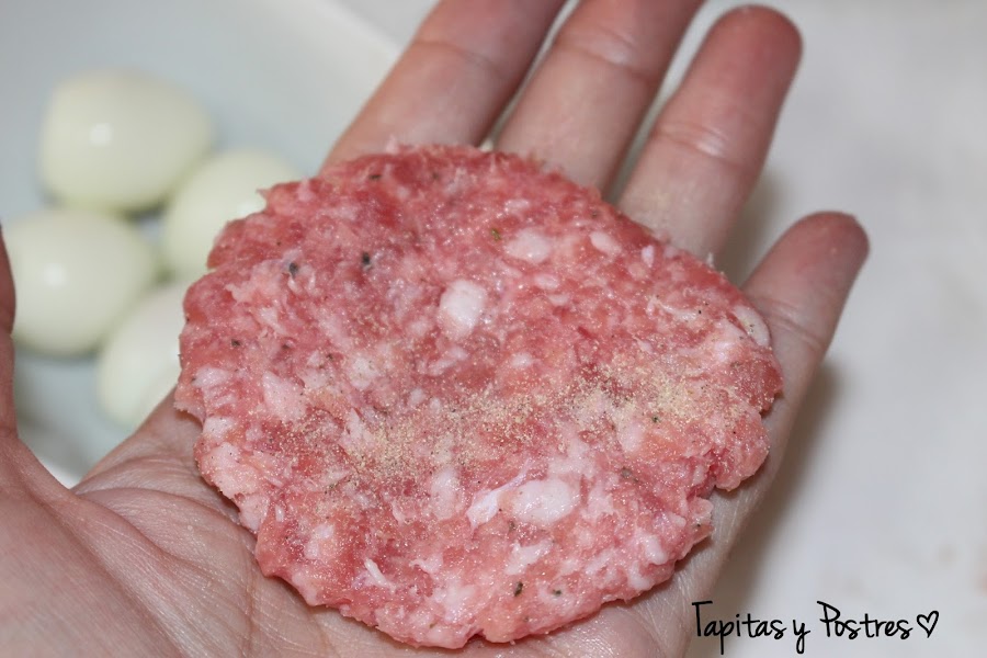Hoy los he repetido, pero en formato mini, con huevos de codorniz y una capita más fina de carne y nada que ver con los anteriores. A ver, que seguro que hay gente que prefiere la receta con huevos de gallina, pues muy bien, las dos opciones son igual de ricas, peo si no quieres reventar mientras te los comes, yo os recomiendo esta alternativa.