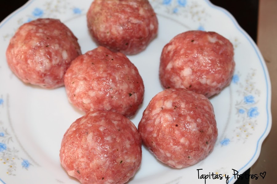 La receta original, se prepara con carne de salchichas frescas, yo lo he hecho con carne picada de cerdo. Incluso con carne de pollo quedan divinos.Vosotros elegís.