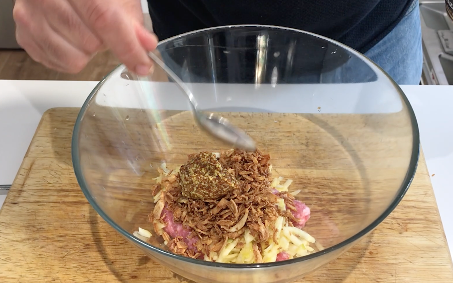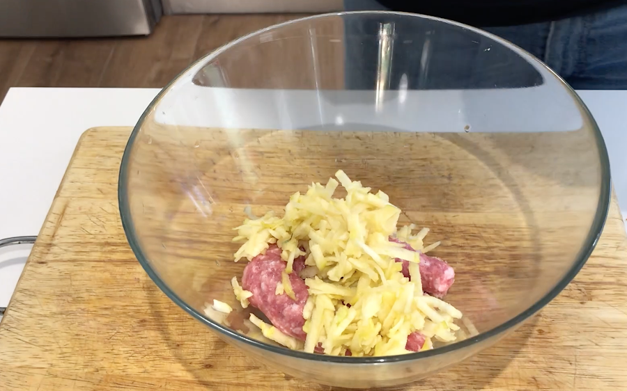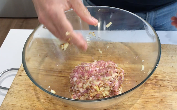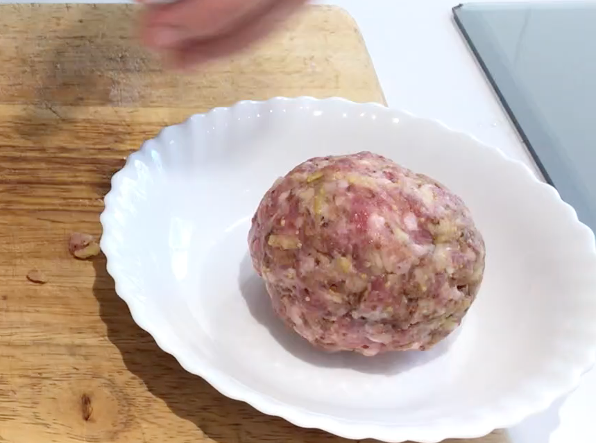 Hacemos un disco con la mitad de la carne picada.
