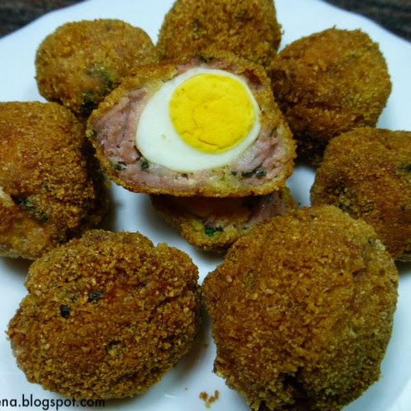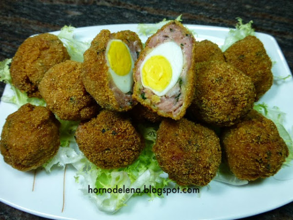 Envolvemos los huevos con la carne y hacemos bolas.