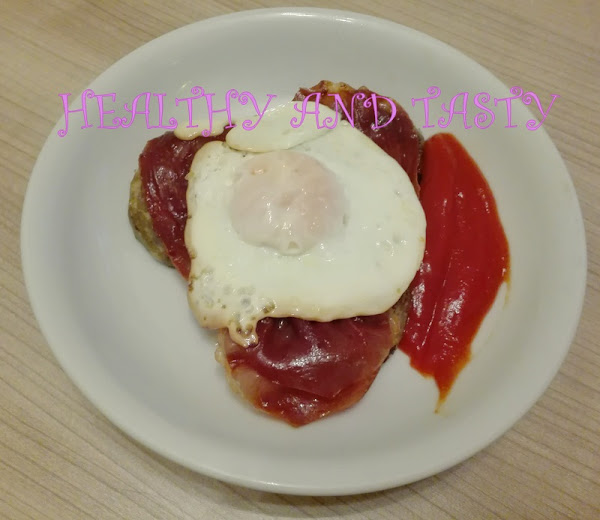 Para montar el plato ponemos tres rodajas de berenjena, encima colocamos el jamón en lonchas y finalmente el huevo encima. Podemos acompañarlo con un poco de tomate frito. Está deliciosa y como veis es muy fácil de hacer.