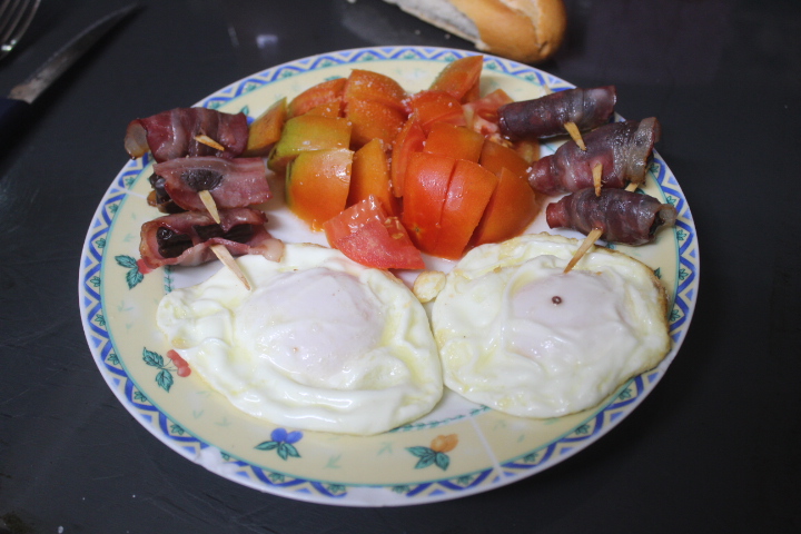 Todos hemos comido un par de huevos fritos, con patatas, para cenar como un rey, pero como las patatas fritas, a pesar de estar riquísimas, están muy vistas, en esta ocasión, he optado por acompañarlos de unos dátiles envueltos en beicon, recién salidos del horno y para desengrasar un tomate con sal cortado a daditos.