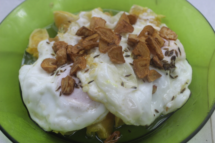 Freímos en una sartén con abundante aceite los huevos, de uno en uno, aderezándolos con comino y sal.