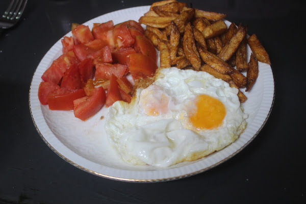 Nada más simple que cenar unos huevos fritos con patatas, pero acompañándolos de un tomatito troceado, para mi gusto quedan mucho más ricos.