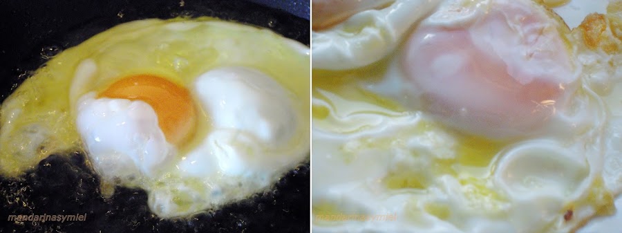 Con ayuda de una espumadera ves echando aceite sobre la clara para que se haga la puntilla si te gusta, y echa un poquito de aceite sobre la yema para que no quede muy hecha.