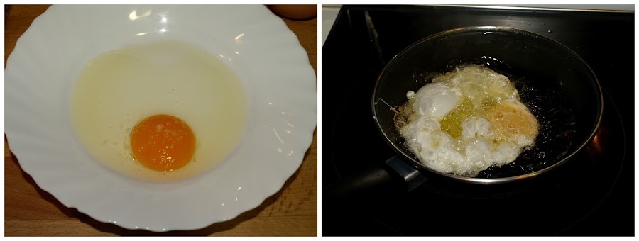 - Por último freímos los huevos para que estén recién hechos. Es un minuto. De uno en uno, ponemos cada huevo primero en un plato, echamos sal en la yema y con cuidado para que no se rompa, con ayuda de una espátula, lo pasamos a una sartén con un par de dedos de hondo de aceite, que deberá estar bastante caliente. Freímos, salpicando sobre la yema con la espátula el aceite para que se cierre /cuaje hasta el punto que nos guste. A nosotros nos gusta que la yema quede más bien líquida por dentro, para luego mojar pan (no sabemos ná! =D ).