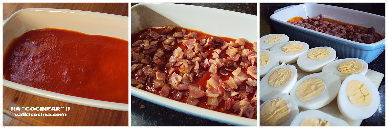 En la fuente apta para horno donde los vayamos a hacer, disponemos una fina capa de tomate frito, añadimos el bacon y colocamos los huevos cortados por la mitad y hacia abajo. Puedes añadir un poco de sal a los huevos.