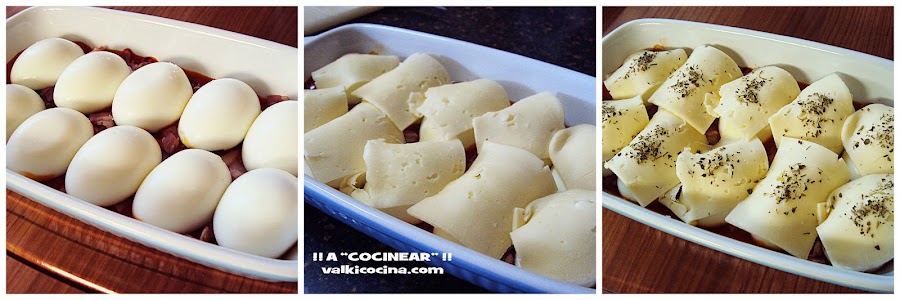 Colocamos encima de cada huevo un trozo de loncha de queso suficiente para cubrirlos, y espolvoreamos si queremos con un poco de orégano.