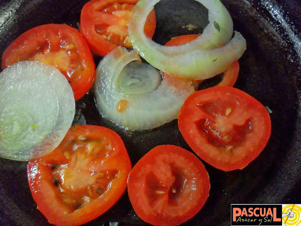 · Ponga las cebollas y los tomates y baje el fuego al mínimo.
