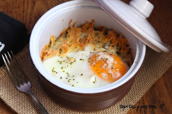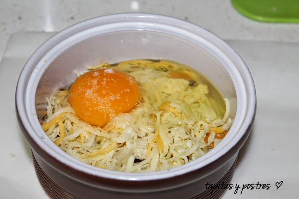Por último cascamos el huevo encima, salpimentamos y espolvoreamos hierbas secas por encima. Al horno. Unos diez minutos.