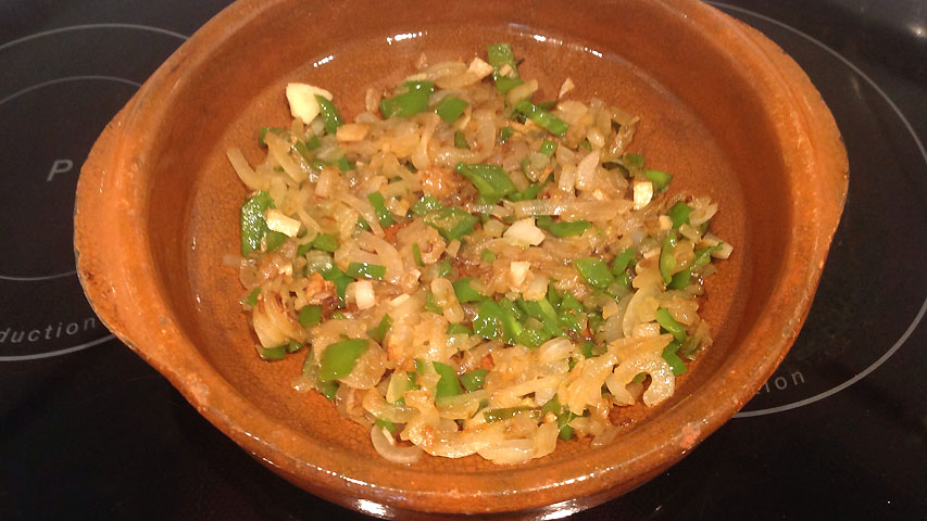 En una sartén a fuego medio-alto (7/10) y con un poco de mantequilla, sofríe la cebolla, el pimiento y los ajos. Cuando esté sofrito reparte el sofrito en cazuelas de barro individuales.
